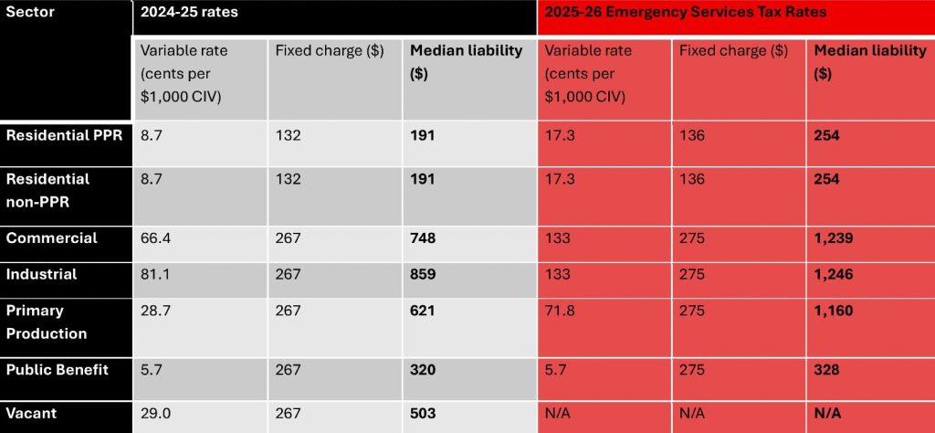 This year, the Allan Government pushed through a new Emergency Services tax on all rate payers – and doubled it. The burden of this significant tax increase will undoubtedly be passed on to renters, small business owners, and farmers. In fact, every member of the Victorian community is affected by this new tax.